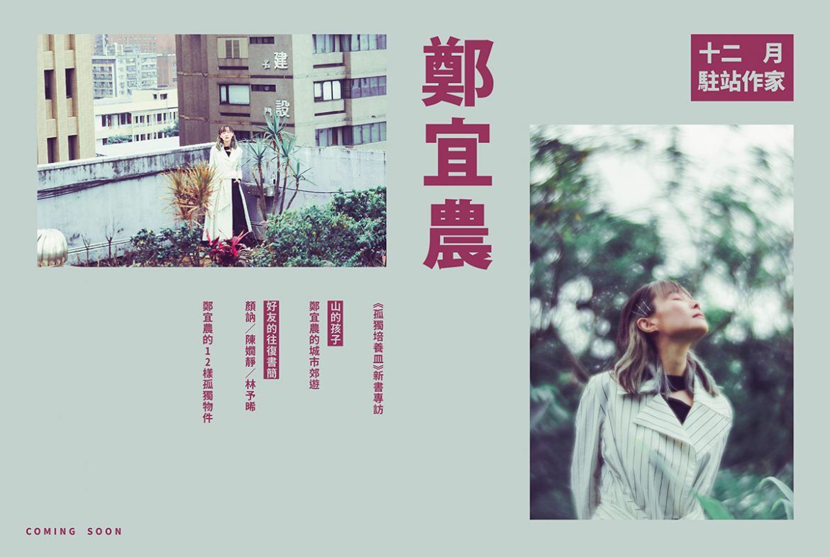 駐站作家鄭宜農2020 【十二月駐站作家】鄭宜農 by 編輯部 2020-12-10 written by 編輯部 2020-12-10 設計|YJ 3.5K 「我好緊張喔!」宜農說。我們也好緊張。 帶著宜農在停車場拍攝、然後過馬路、散步到大安森林公園。拿出偷偷準備的棒球手套,我們一起在草皮上傳接球,然後踩著公園裡會噴水的奇怪腳踏車。讓我們看著這支充滿彩蛋的前導,12月,準備好走入宜農一個又一個的,孤獨培養皿。 玻片裡的預言專訪《孤獨培養皿》作者鄭宜農全文閱讀山的孩子鄭宜農的城市郊遊全文閱讀12樣孤獨物件全文閱讀好友的往復書簡顏訥/陳嫻靜/林予晞全文閱讀 Previous slide Next slide 鄭宜農孤獨培養皿 0 comments previous post 【當月精選】之間的風景,與(應有的)潛行—青壯世代台灣小說家創作觀察 next post 【當月精選】天鵝般的小説怪物:邱常婷 You may also like 【當月精選】文字... 2021-07-09 WFH平安通訊|... 2021-06-23 【十二月駐站作家... 2020-12-24 【十二月駐站作家... 2020-12-21 【十二月駐站作家... 2020-12-15 【十二月駐站作家... 2020-12-14 【手寫日記|九月... 2018-09-01 發表意見取消回覆 這個網站採用 Akismet 服務減少垃圾留言。進一步了解 Akismet 如何處理網站訪客的留言資料。
