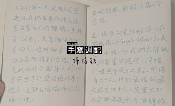 五月的第一週,老朋友俞萱邀請,在她策畫的線上講座分享自己的體驗。主題是「涉險」。我是個傾向安全的人,也許她在我的詩本身就讀到險境?或是我的作品斷層太大,似乎發生了什麼很險的事?總之,這題目偏偏暗合此時心境。