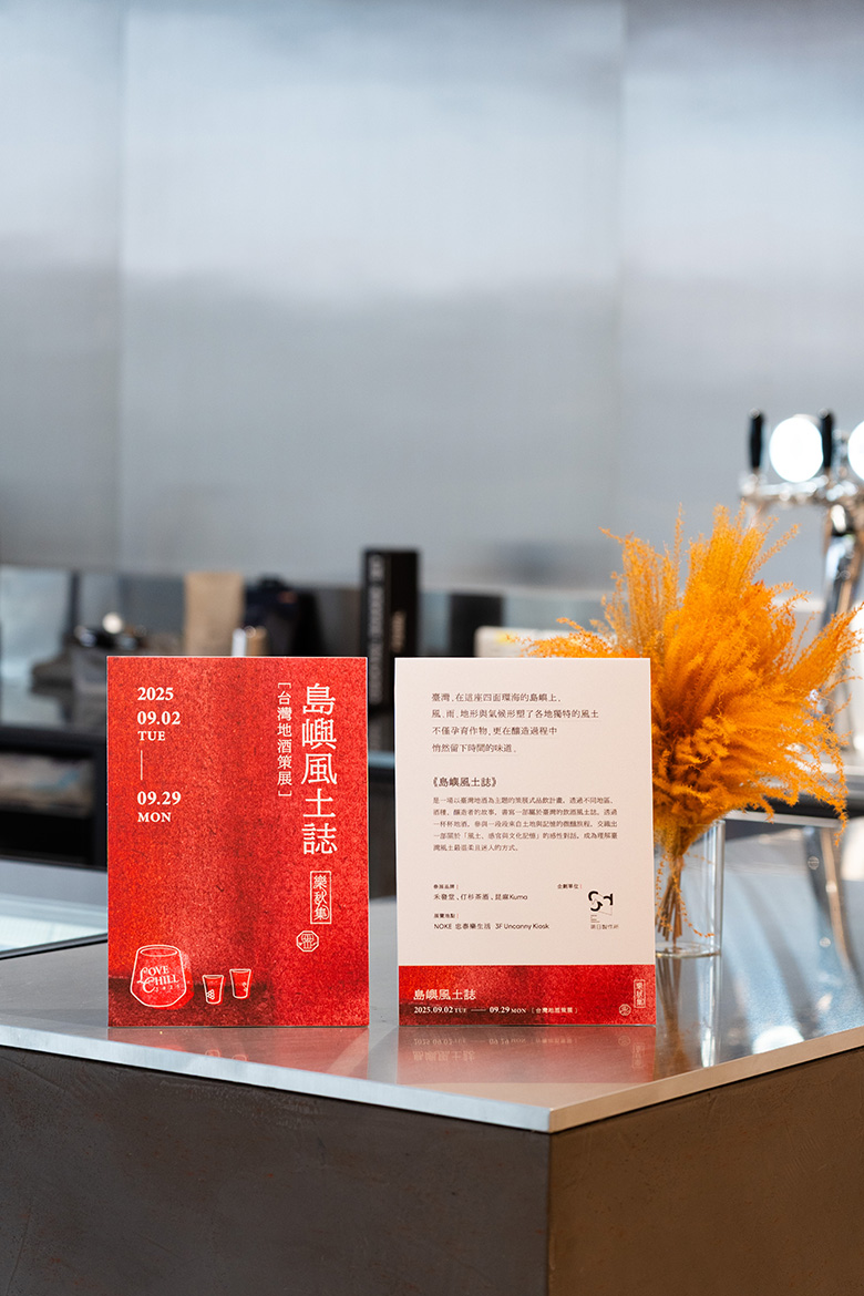 秋日的滋味,既隱於島嶼的風土,也潛藏於文字的細節。《島嶼風土誌》臺灣地酒策展,以三款台灣地酒——琴酒、茶酒與果實酒——為起點,邀請小說家高翊峰撰寫短文,讓風味與文字彼此映照。展場中,酒水的層次將透過聞香瓶細細綻放,而詩意的語句則如同氣息般瀰漫,與觀者一同參與這場感官與文學的交會。每一口酒的餘韻,都是土地的記憶;每一句文字的停頓,則是故事的回聲。在這裡,酒與文學並肩,交織成一幅秋日的風土詩篇。