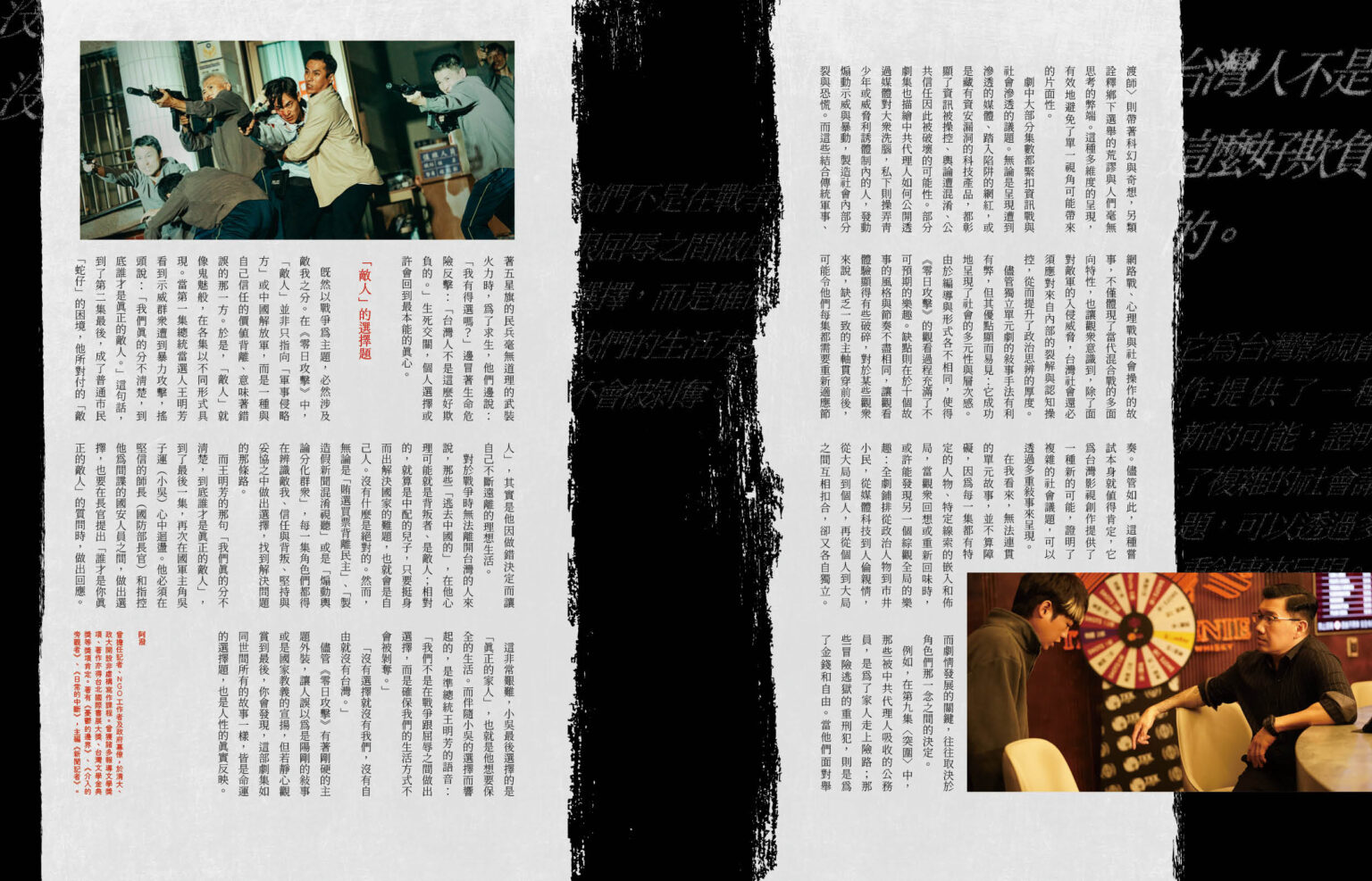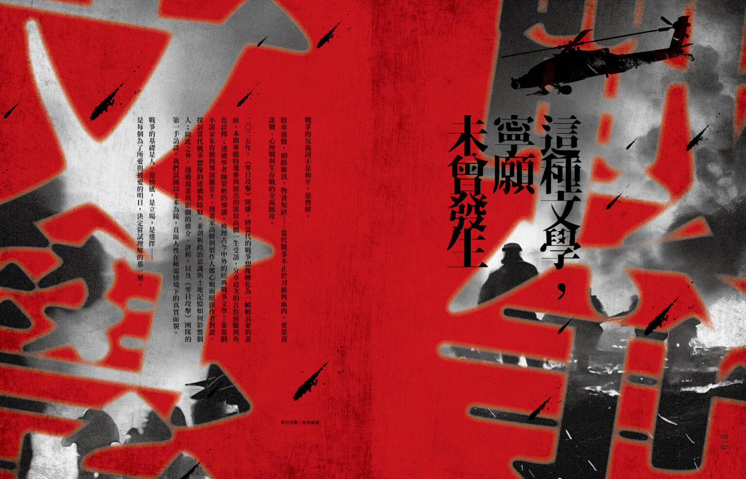 二〇二五年,《零日攻擊》開播,將當代的戰爭想像轉化為一幀幀具象的畫面。本期專題特邀參與演出的演員高橋一生受訪,分享這次的合作經驗與角色詮釋;透過學者陳榮彬的導讀,梳理古今中外的經典戰爭文學;並策劃小說家朱宥勳與導演羅景壬、漫畫家高妍與製作人鄭心媚兩組創作者對談,探討當代戰爭想像的建構與除魅,並剖析政治意識與土地記憶如何影響個人;除此之外,透過漫畫與影劇的推介、評析,以及《零日攻擊》團隊的第一手訪談,我們試圖以文本為鏡,直面人性在極端情境下的真實面貌。