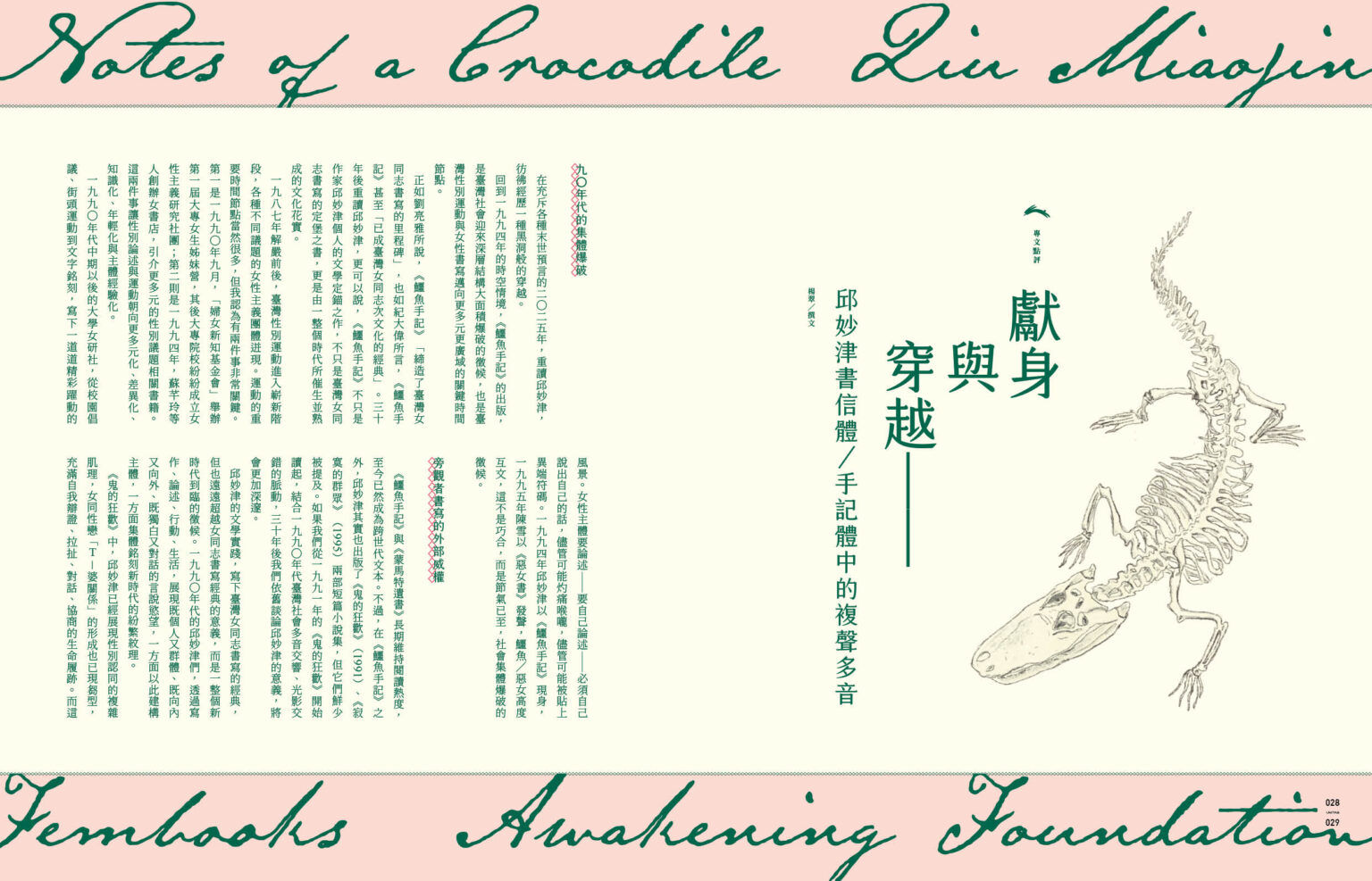 適逢邱妙津逝世三十周年,我們邀請台灣學者楊翠、劉亮雅與周芬伶全方位解析《鬼的狂歡》、《鱷魚手記》、《寂寞的群眾》、《蒙馬特遺書》與《邱妙津日記》;也請來《鱷魚手記》日文版譯者垂水千惠爬梳小說與日本文學中的鱷魚意象;更邀請《蒙馬特遺書》英文版譯者韓瑞、編輯楊君磊從不同文學傳統切入,分享英語讀者如何理解邱妙津。最後,我們邀請邱妙津生前友人分享他們記憶中的小說家——社團學姊、桌球校隊、早慧作家、巴黎室友——並邀請作家寫一封信給邱妙津。