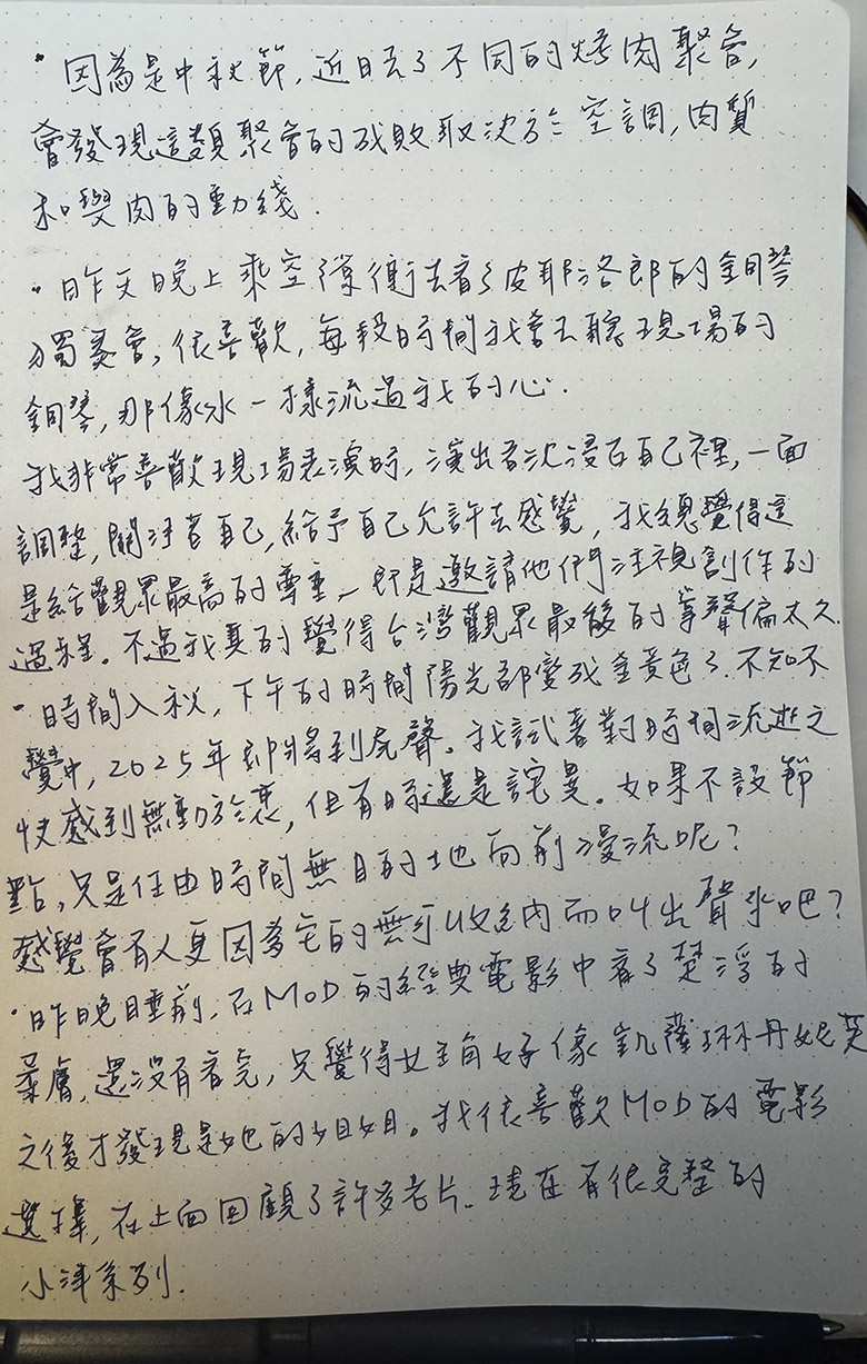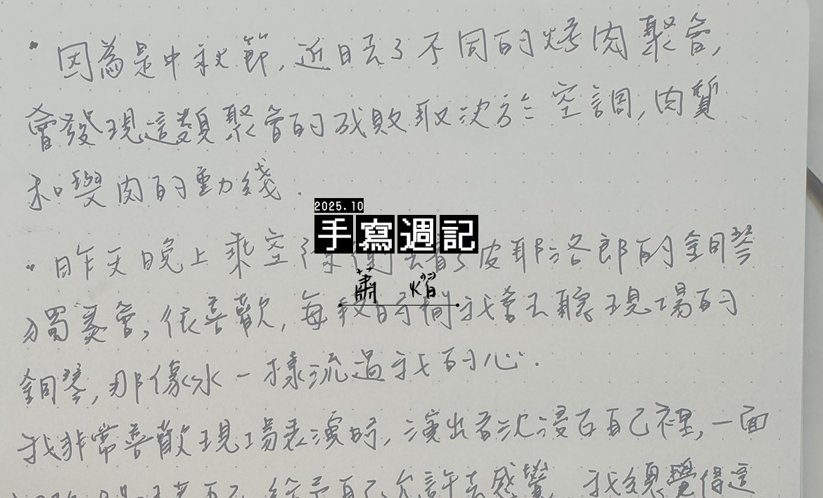 十月,我們邀請作家蕭熠,在手寫週記中展開一個月的日常觀察。在他的最新小說中,時而俯瞰、時而仰望,透過多聲道的視角,映照出人與人之間如同影與月的呼應或對立。這樣細膩的凝視,也將延伸至他的生活書寫。本月,他將以手寫字,記錄那些擦身而過的瞬間,在人情的複聲合唱裡,捕捉屬於他獨特的觀景窗。