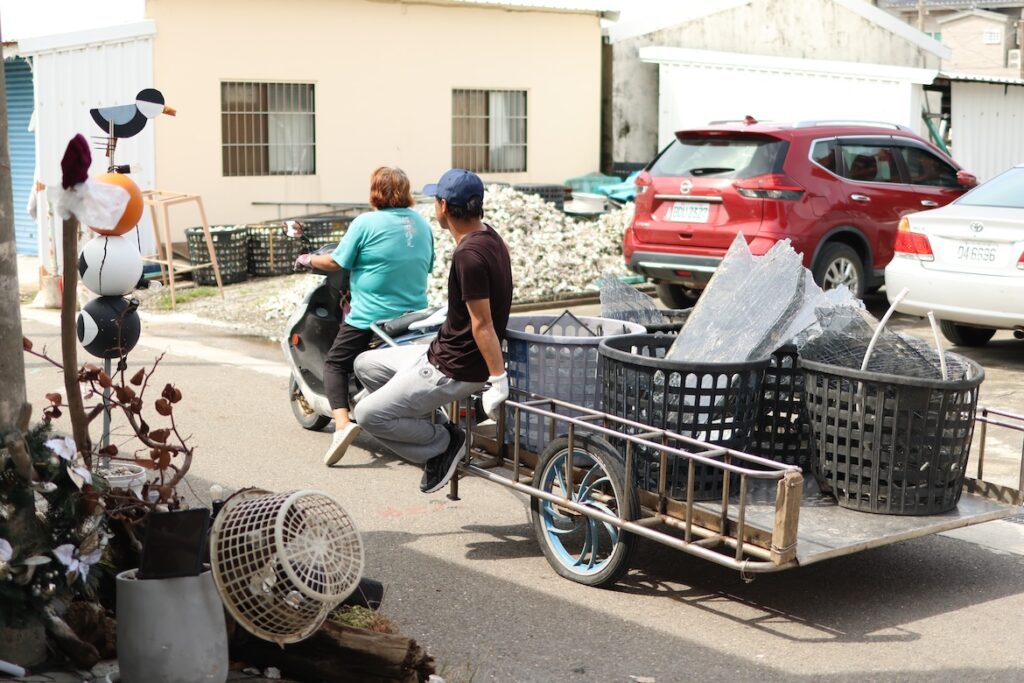 正在用蚵車(李阿卡)清運廢棄物的蘆竹溝居民