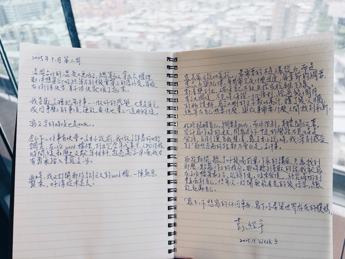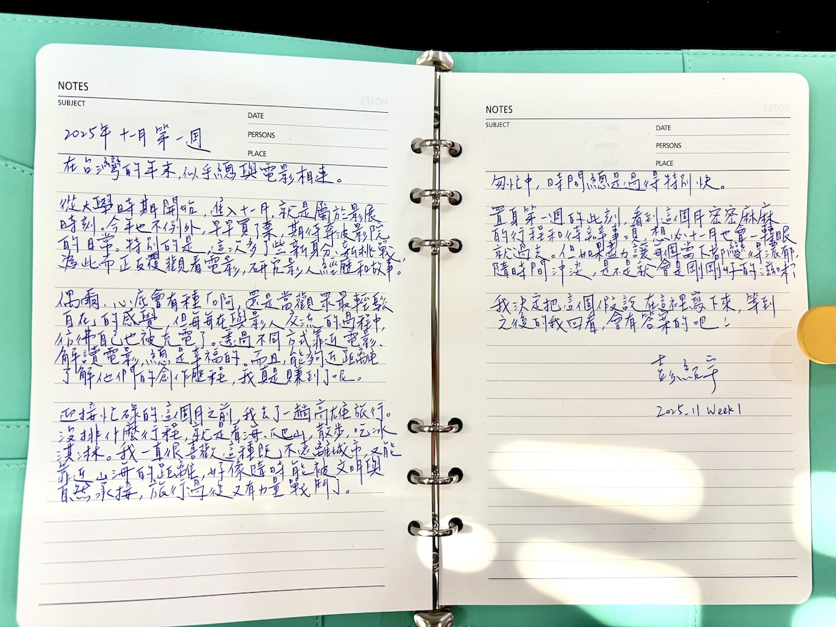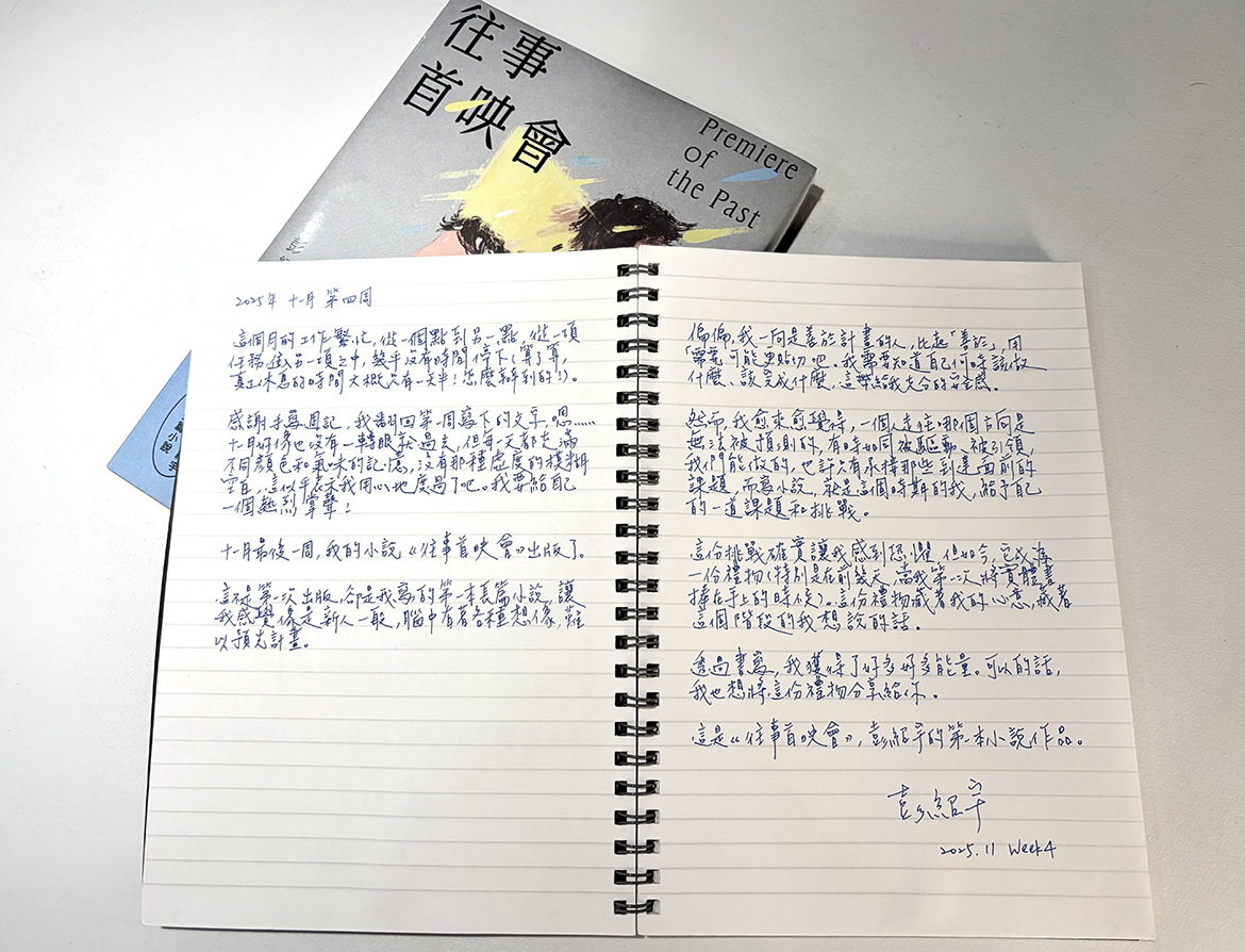 十一月,我們邀請作家彭紹宇,在手寫週記中展開一個月的日常書寫。在他即將出版的首部長篇小說《往事首映會》中,時空於老戲院裡交錯,青春的躁動與歷史的陰影,在緩慢展開的放映中共同顯影。他相信文字與影像,是我們修補傷痕、與過去和解的可能。本月,他將以手寫字,記錄生活裡那些閃爍的畫面與低語,如同為此刻的日常,舉行一場溫柔的往事首映。