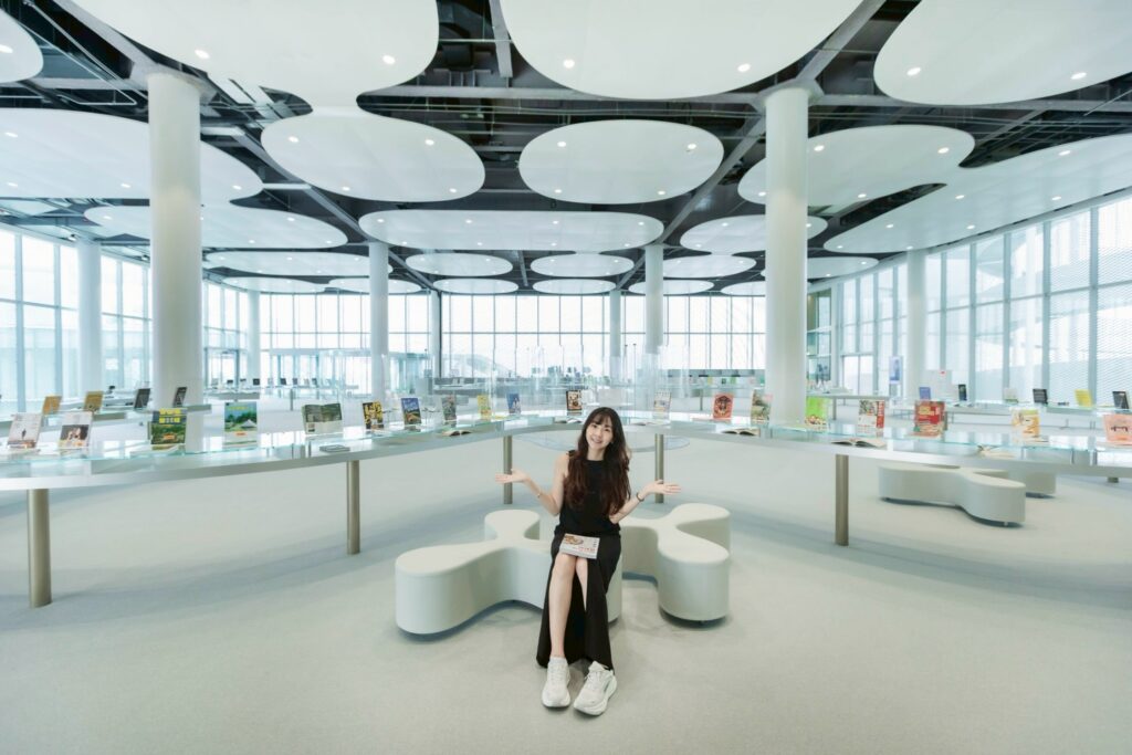 位於3樓的圖書館大廳挑高7公尺,以流線型與反光鋁板家具組成空間語言,使光影在室內緩緩流動。服務櫃台、自助借書機、館藏查詢與圖書消毒設備規劃完善,使大廳兼具美觀與實用性。