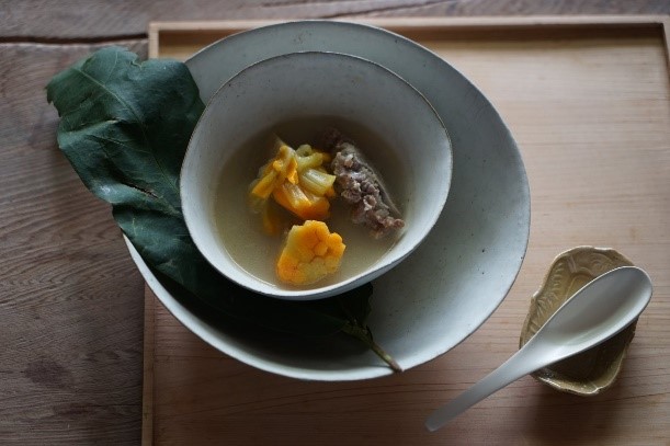 左圖是麵包樹的果子,原住民稱「巴吉魯」,帶有嶙峋的外皮,內裡卻似金針菇般一絲一絲的質地,右圖參考原住民的煮法,製作成麵包果排骨湯。