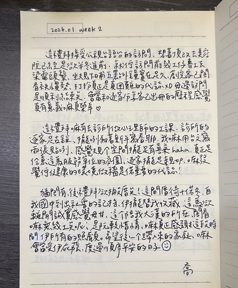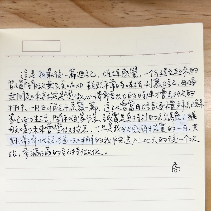 這是我的最後一篇週記,突然感覺,一個好不容易建立起來的習慣又要消失了呢 XD。雖然平常也都有在寫日記,但忙起來就常常變成心情需要出口時才會去翻閱的東西,一個月可能只寫一篇。這次能用台語每週紀錄自己的生活,還和大家分享,真的是很特別的經驗!還不知道未來會變得如何,但我想要感謝充實的一月,將對許多事還一知半解的我,平安送入 2026 年的下一個階段,帶著滿滿的回憶前行。