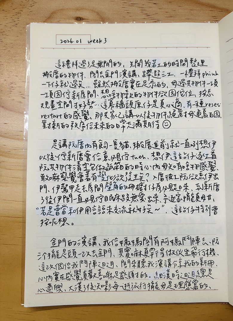 這是我最後一篇週記,雄雄感覺,一个今建立起來的習慣閣欲無去矣呢 XD 雖然平常時嘛攏有咧寫日記,毋過無閒起來就定定變做心情需要出口的時陣才會去掀的物件,一月日可能干焦寫一篇。這改會當用台語逐禮拜紀錄家己的生活,閣佮逐家分享,誠實是真特別的經驗!猶袂知影未來會變做按怎,但是我欲感謝充實的一月,共對濟濟代誌猶一知半解的我平安送入二○二六的後一个坎站,參滿滿的記持做伙。