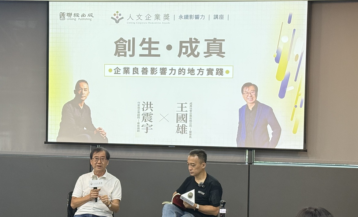 這場由聯經主辦的人文永續講座,也同時公布了「第三屆人文企業獎」報名開跑,透過這樣的平台,希望吸引有志一同、認同人文價值的企業團體交流、分享與參與,進而形成正向的影響力。參加講座嘉賓,都是對企業永續及地方創生等議題有興趣的公司團體代表,發問熱烈;有來賓問到成真如何說服員工一起實踐社會企業,王董回答是:先要找對的人。不論是基層員工還是高層主管,都要先對齊彼此的價值觀,這步驟已找到半個對的人;另外在月會上布達人文價值的訊息,也很有效。聯經出版陳芝宇總經理則請教王董「利他也是利己」的概念。王董說,早期企業只顧自己,成本由社會吸收。將人文納入價值,先利他再利己,不僅找到認同理念的夥伴,也讓品牌故事更易傳播,形成正向循環。