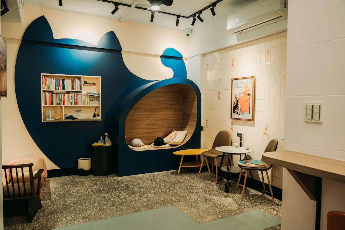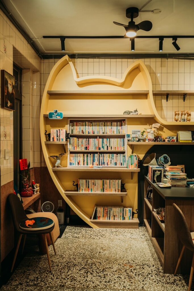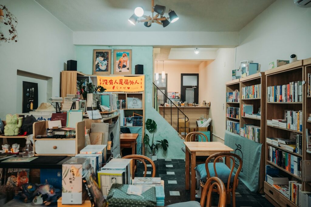 躲在武聖夜市旁的靜巷裡,紙頁的氣味與生活的溫度一同漫開。書架間留有從容走動的距離,角落那座小廚房偶爾飄出咖啡香,兩隻貓時而蜷在書堆上,時而輕巧躍過客人的腳邊,比起書店,這裡更像兩位愛書人悄悄打開的家。老闆西瓜曾在臺北多間獨立書店流轉,與因聊書結識的夥伴友俞幾乎未多作猶豫,便選擇在生活步調較慢、仍待探索的臺南開張,為未來保留更多可能。選書未標榜鮮明旗幟,以臺灣文學、漫畫為主,女性主義、社會學、人類學等各種主題靜靜並列在架上,如同日常裡自然存在的各種視線。二樓則為內閱區,適合讀書、發呆,或只是聽貓走動的細碎聲音。