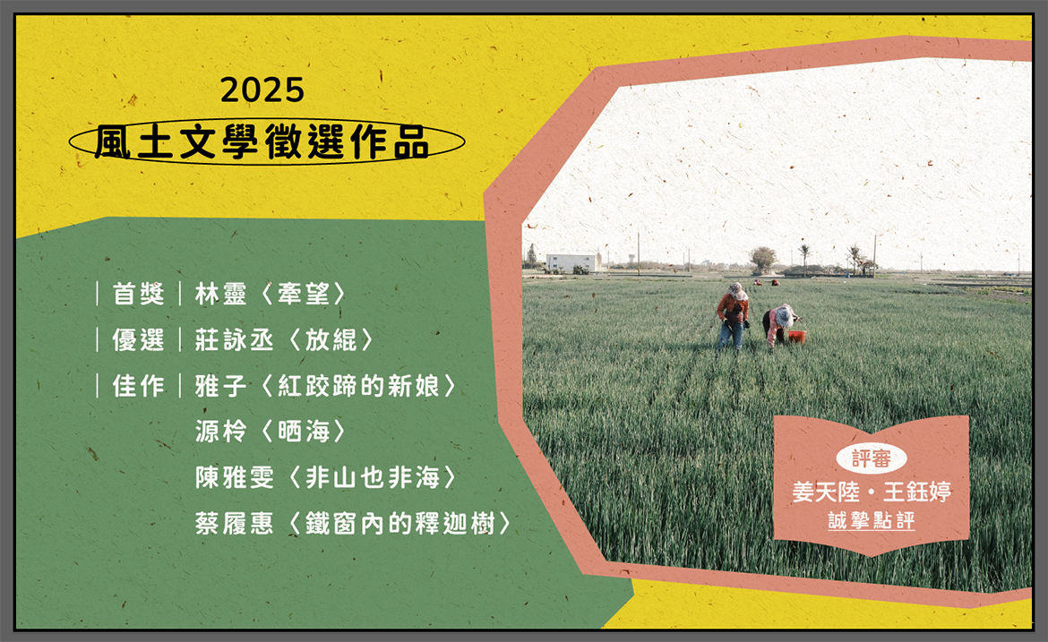 「風土文學徵選」來到第二屆!本次收獲一百二十件作品,並邀請兩位臺南籍的創作者與研究者──小說家姜天陸、學者王鈺婷進行擔任評審,為我們選出六篇精彩深刻的風土文學作品。