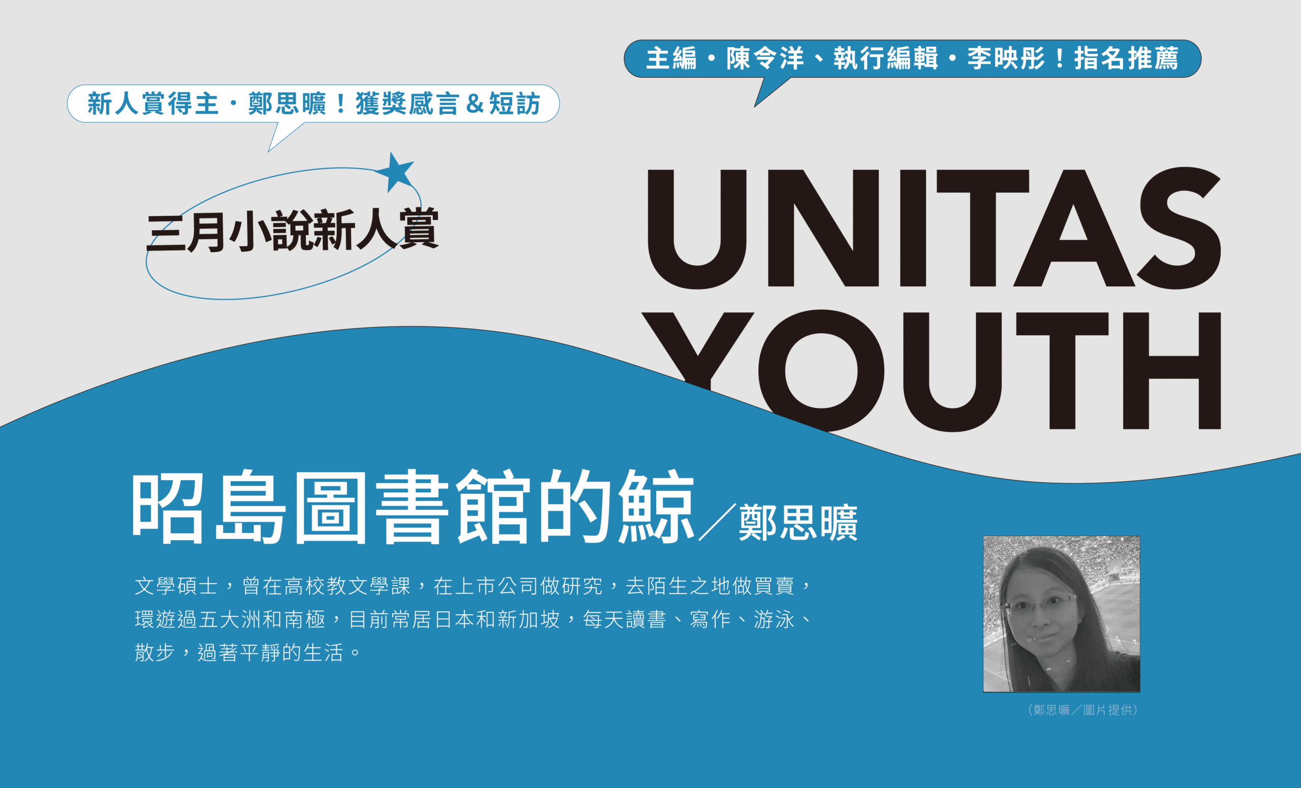 文字間流動著一種如水般的清冷透明感,在層層意象的堆疊中,維持著極佳的敘事節奏與呼吸空間。讀其文字,彷彿置身日本街邊的咖啡館窗邊沙發座。作者將兩百萬年前的「昭島鯨」與老袁六十三年的平凡人生交織,在滄海桑田的宏大尺度下,更顯出老袁孤寂中的柔軟本質。——李映彤(執行編輯)
