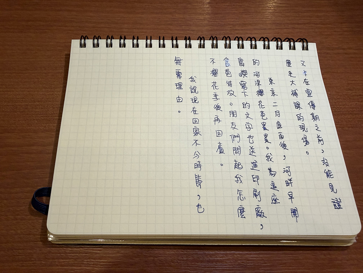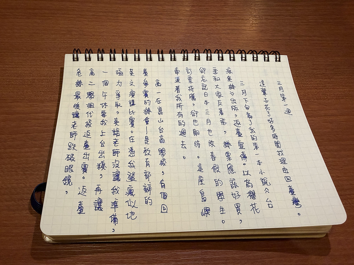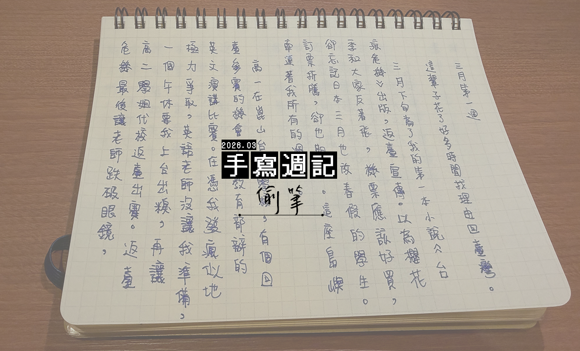 三月,我們邀請作家偷筆,在手寫週記中展開一個月的日常書寫。旅居日本從事 IT 產業的他,白天在科技與邏輯中教電腦「說人話」,下班後則轉身拿搖起筆桿,在小說中構築世界。在他的首部作品《台孩危機》中,以輕快詼諧的筆觸,描繪跨境世代在家庭與認同縫隙間,那份如「訊號搜尋中」般的荒謬與迷惘。本月,他將放下敲擊鍵盤的雙手,以手寫字記錄異國生活裡的瑣碎與趣味,與讀者在文字的流轉間幽默起舞。