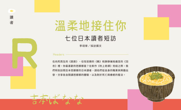 在向死而生的《廚房》、任性狡猾的《鶇》和靜靜擁抱痛苦的《羽衣》裡,你最喜歡的芭娜娜是?在新作《吹上奇譚》完結之際,我們特別訪問吉本芭娜娜的日本讀者,請他們從自身的職業與興趣出發,分享各自閱讀芭娜娜的體驗,以及對於死亡與療癒的看法。