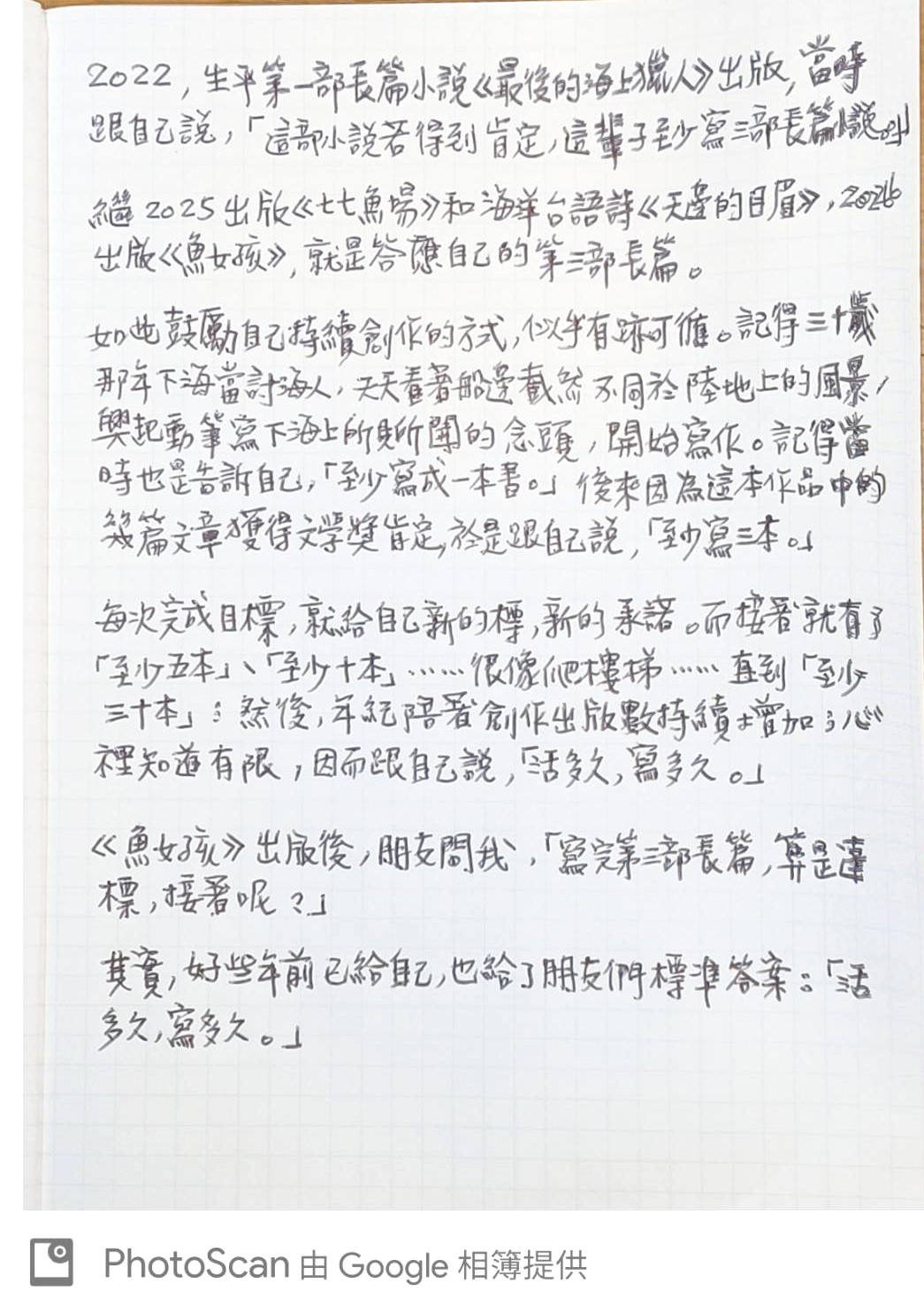 2022,生平第一部長篇小說《最後的海上獵人》出版,當時跟自己說,「這部小說若得到肯定,這輩子至少寫三部長篇小說。」