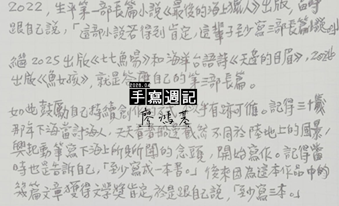 四月,我們邀請海洋文學作家 廖鴻基,於手寫週記中展開一段貼近日常的書寫旅程。新作《魚女孩》如同潛入內在深海,穿梭於記憶、夢境與現實之間,那些反覆顯影的身影,既神祕也熟悉。本月,他暫緩遠航,以一週一篇的手寫文字,記錄生活片刻與心中暗湧,在平靜字句之中,帶領讀者靠近那片深藏已久的內在海域。
