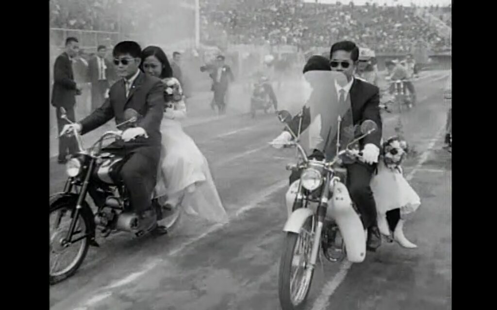 喜好騎車的新人,也可以考慮帥氣的機車婚禮。一九六八年,在臺北市立體育場舉辦的全國自由車及機車比賽大會,一方面提倡國民體育運動與宣導交通安全,一方面也為後續國際賽事暖身,個人與團體報名皆十分踴躍。大會安排各項競賽與表演活動,像是裕隆機車女子儀隊操槍演出,以及鈴木雷虎機車隊的疊人駕駛與坐墊立人特技等等。會場另一大亮點,便是機車婚禮——在車隊環繞下,三名戴太陽眼鏡的新郎騎車進場,載著身穿婚紗、手握花束的新娘,在熱血沸騰的賽事氛圍中更顯浪漫。
