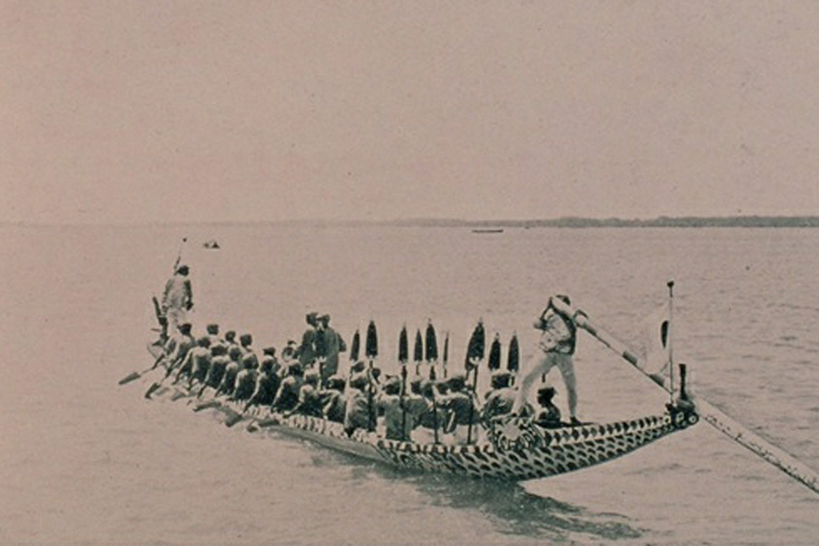 1930年龍舟賽在安平海口舉行,此舟體型甚大,一艘可乘24人。(翻攝自《日本地理大系─臺灣篇》)