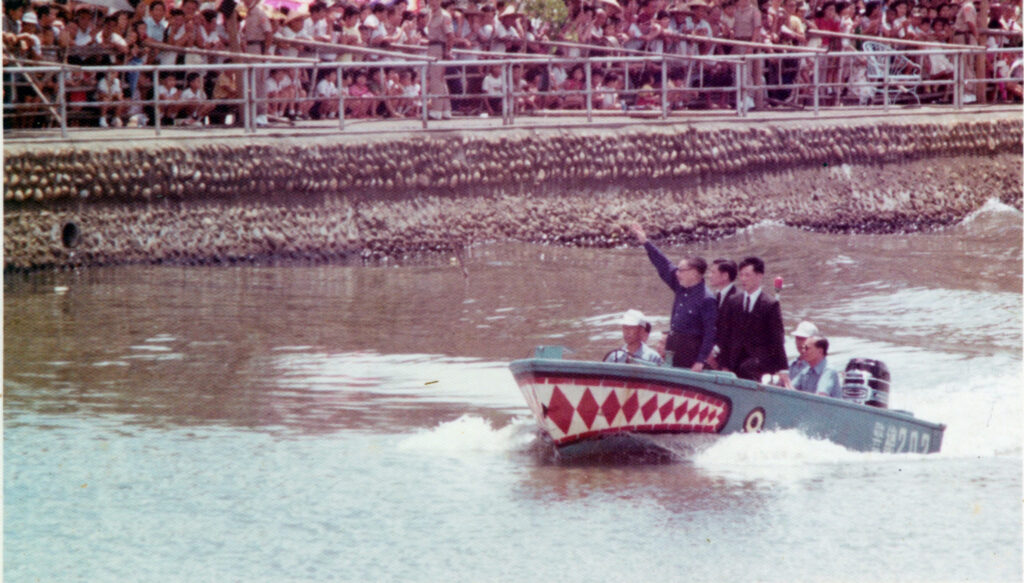 1975年臺南市龍舟比賽,尚在守孝的行政院長蔣經國,搭乘小艇來到龍舟賽現場,備受矚目。(蔡世仁提供)